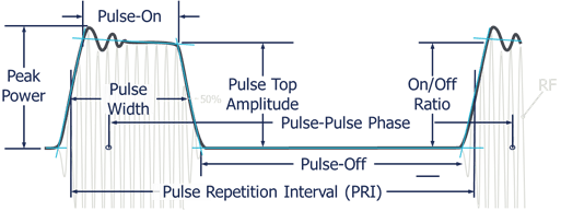 RF pulse characteristics such as those illustrated below reveal a great deal about a radar's capability. Electronic Warfare (EW) and ELectronic lNTelligence (ELINT) experts specialize in the study of these pulsed signals. Pulse characteristics provide valuable information about the type of radar producing a signal and what its source might be - sailboat, battleship, passenger plane, bomber, missile, etc.