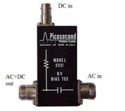 The PSPL5531 is a broadband coaxial bias insertion tee for low current applications such as biasing photodetectors. It is rated for 1.5 kV. It is designed to pass fast rise time pulses with minimum waveform distortion. The rise time is 35 ps with a –3 dB bandwidth extending from 750 kHz to 10 GHz.