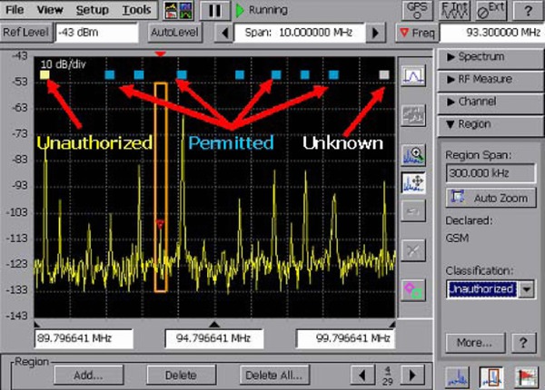 - Enhances SA2500 by adding signal classification to the Spectrum Notes capability. Provides capability to notate (label) regions of RF spectrum. Provides capability to compare bandwidth, channel frequency, etc., to internal tables of standards. Can save a mask (stored display) of user-generated mask to enable spectrum violation measurement. Provides database to store these notation results, along with GPS location and time.