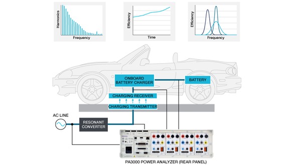 Key tests include efficiency and harmonic analysis. The 4-channel PA3000 enables testing power at each stage of the wireless charging system, including transmitter and receiver.