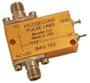 The PSPL5543 is an ultra-broadband, 500 mA current, coaxial bias insertion tee and 100 V DC blocking capacitor that passes high bandwidth pulses with very low waveform distortion. Its rise time is only 7 ps and its frequency response is flat over many decades from 20 kHz to beyond 50 GHz.