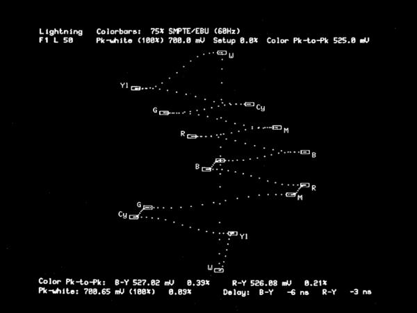 The Lightning measurement uses the Color Bar signal to create a display similar to the WFM300A Component/Composite Waveform Monitor display. In addition, it provides numerical readouts of the peak-to-peak amplitude for B-Y and R-Y peak white amplitude and chrominance to luminance delay.