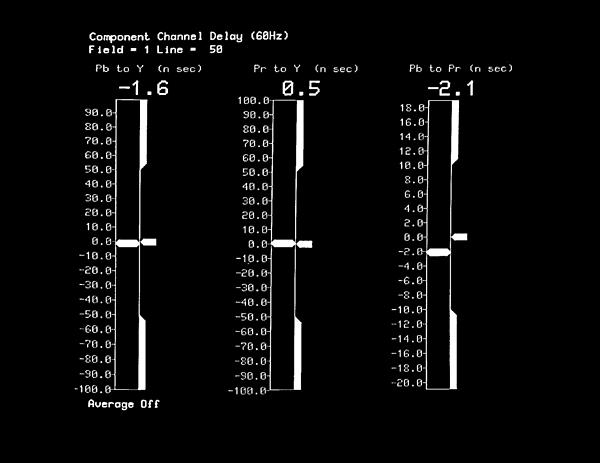 The Channel-delay application measures and displays the delay between all three channels. The three results are displayed on three simultaneous bar graphs which can be read easily from a distance. The measurement uses the bowtie signal.