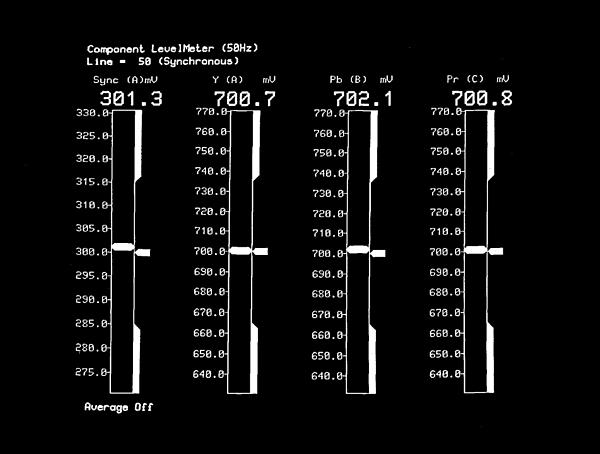 The Level Meter application measures video level of all three channels and displays them on three simultaneous bar graphs. An additional bar graph indicates the sync amplitude for channel A. This latter bar graph can also be easily configured via soft keys to measure any other part of the signal on channel A.