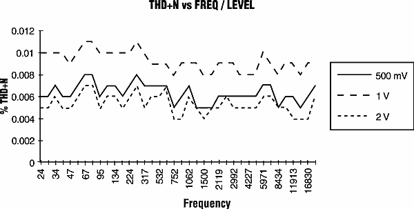 Residual THD+N - ≤0.01% (≤-80 dB) measured over a 20 kHz bandwidth, for inputs from 10 Hz to 10 kHz above -13.5 dBu.
