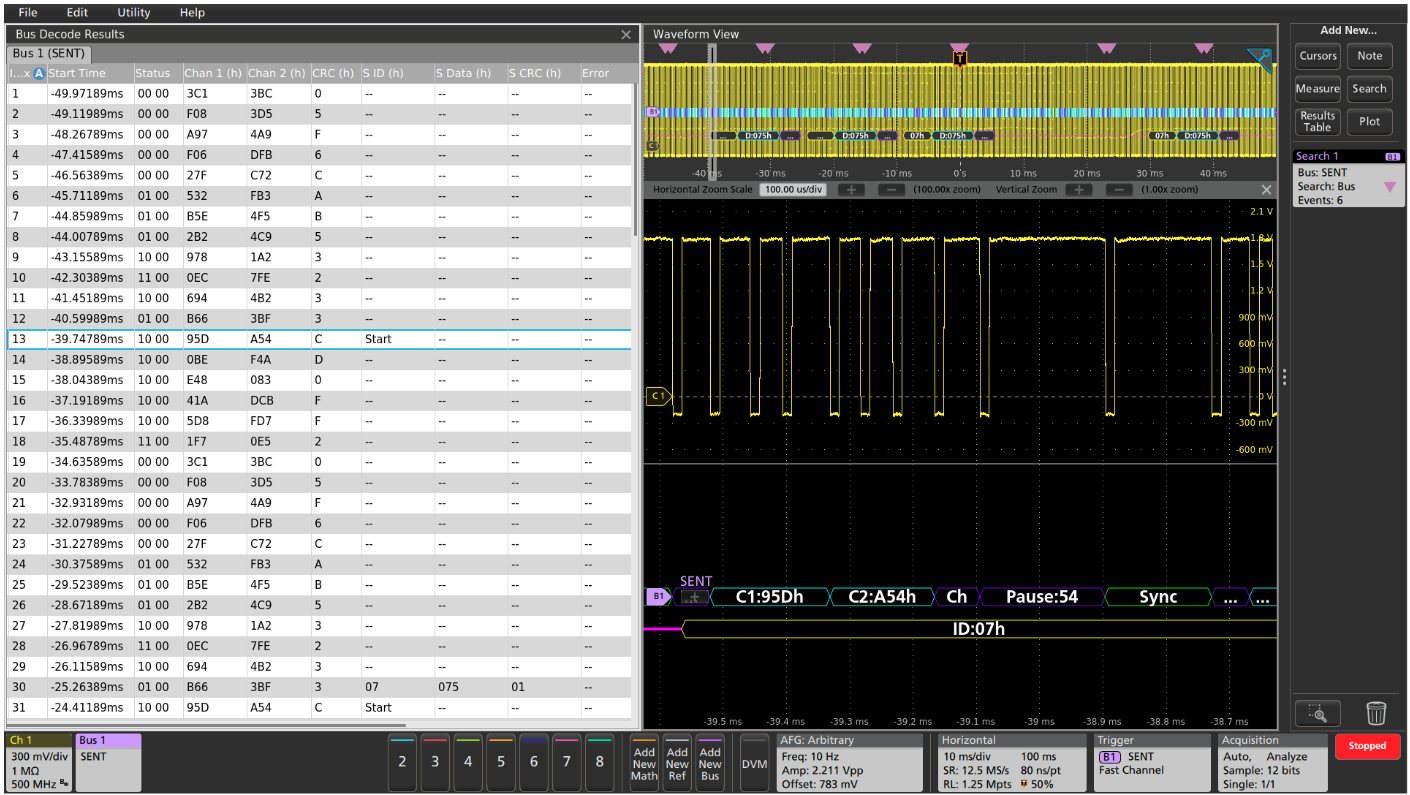 The time-correlated waveform and bus decode display is a familiar and useful format for many hardware engineers. The decoded bus waveform indicates the elements of a SENT fast-channel message.