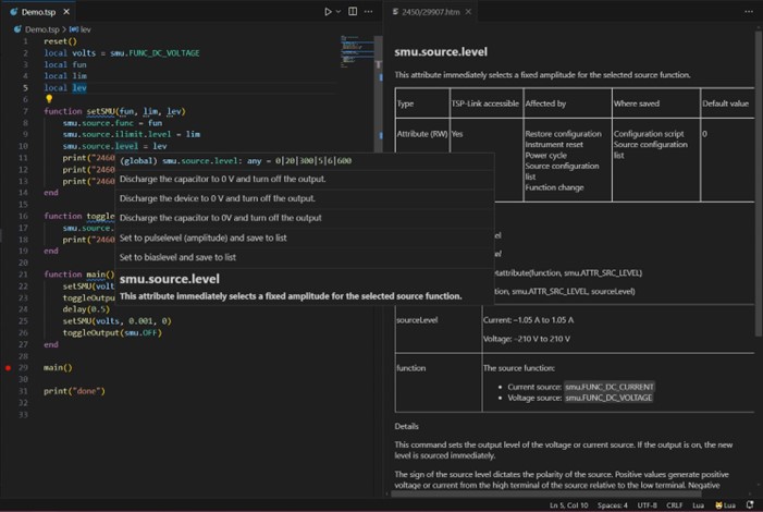 The TSP Toolkit extension also features TSP command autocompletion alongside in-line and hover help, eliminating the need to manually parse through dense reference manuals to confirm proper command usage and syntax.