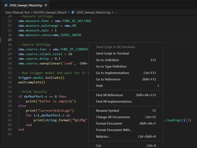 TSP Toolkit features the modern user interface (UI) of the Microsoft Visual Studio Code editor (VS Code), complete with syntax-highlighting for TSP to increase readability. VS Code also offers hundreds of additional extensions, so users developing with multiple programming languages can seamlessly integrate TSP script development into their workflows.