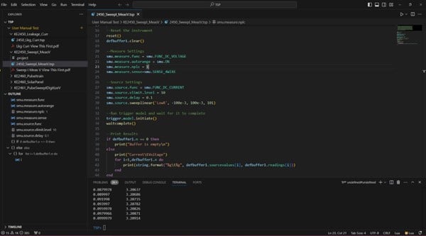 TSP Toolkit is an updated script development environment taking the form of a Microsoft Visual Studio Code extension that includes instrument support for Keithley TSP-enabled instrumentation such as source measure units (SMUs), digital multimeters (DMMs) and data acquisition systems (DAQs), plus many quality-of-life features that improve the script development experience. TSP Toolkit is replacing Keithley Test Script Builder (TSB) and features all the same functionality plus more.