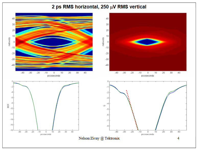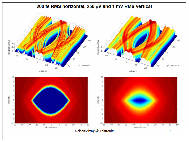 - Systems which suffer from unbound noise in the order of SNR of 100:1 (40 dB) (signal to rms noise), or more (noise – i.e. lower SNR) and exhibit significant rise/fall times (nearing the UI in duration),can not be modeled to low BERs (10-12 or lower) with a jitter-only models (such as Dual Dirac) and more elaborate two-dimensional model is required to analyze BER.