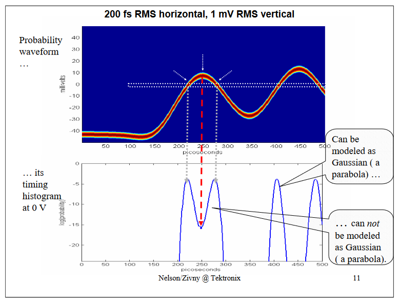 Here is the waveform around one of the heavily impaired bits (the one pointed out on the slide "1 ps RMS horizontal, 250 uV RMS vertical"). If one would measure the "RJ" at the decision threshold with an histogram (the histogram box being the white box in the middle of the top image) one can see that at low probabilities its histograms (lower image) are certainly not Gaussian - if they were, they would be parabolic on a log scale. Instead, the two histograms bleed together and are biased toward the middle (pointed out by the red arrow), simply because of vertical noise and waveform curvature. The histograms are not simple Gaussians, so the "jitteronly" view and the dual-Dirac approximation are insufficient to describe this signal.