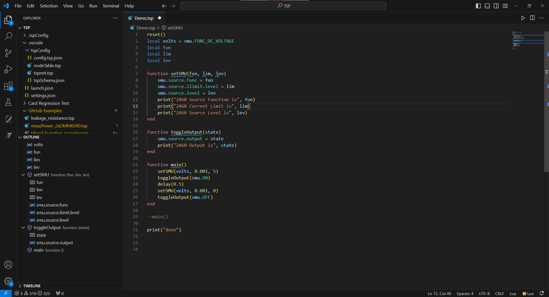TSP Toolkit is a Visual Studio Code extension that simplifies building TSP scripts for instrument control and automation of TSP-enabled instruments, including the MP5000 Series and supported SMUs and PSUs, and our DAQs, DMMs, and Switches.