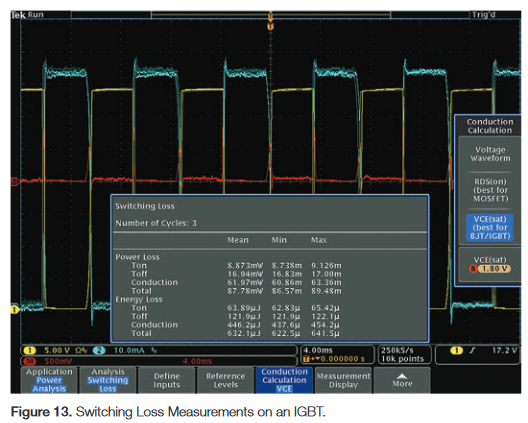 A major challenge in measuring Turn-on and Turn-off losses is that the losses occur over very short time periods, while the losses during the remainder of the switching cycle are minimal. This requires that the timing between the voltage and current waveforms is very precise, that measurement system offsets are minimized, and that the measurement’s dynamic range is adequate to accurately measure the On and Off voltages and currents. As discussed earlier, the probe offsets must be nulled out, the current probe must be degaussed to remove any residual DC flux in the probe, and the skew between channels must be minimized.