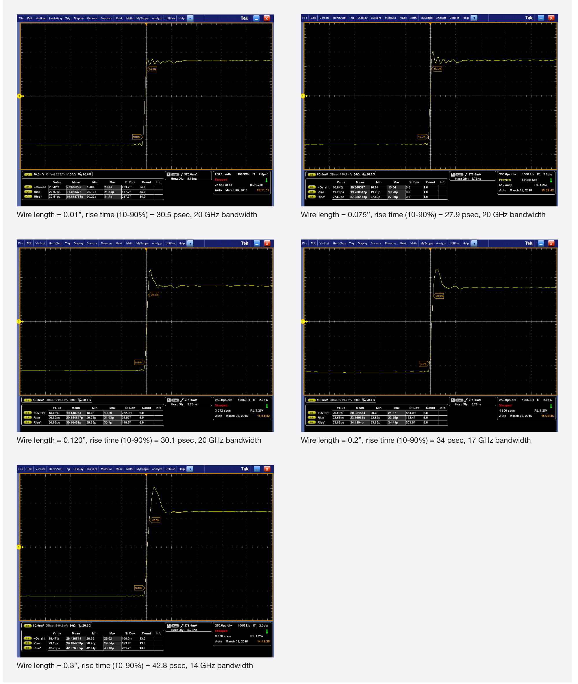 FIGURE 16. Bandwidth and rise time measurements with various wire lengths.