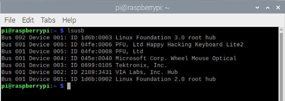 The “Tektronix, Inc." device refers to the oscilloscope. If the Raspberry Pi does not detect the Tektronix device, repeat the steps above with a different USB port or cable.