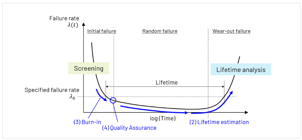 Reliability testing may occur during both the quality development phase and the production phase. Quality improvement, which covers finding the causes of failure and the improvement of failure modes, and lifetime estimation, which requires determining the product’s time to failure or degradation, typically occur during the quality development stage. Meanwhile, burn-in and quality assurance tests for generating evidence that the product does not degrade under different stress conditions usually happen during the production phase. Figure 1 shows the rate of failure over time and when different reliability tests occur.