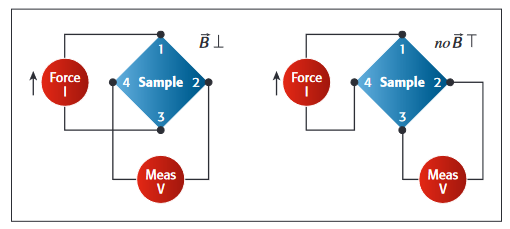 Figure 3 illustrates the measurement configurations for both the Hall voltage and the van der Pauw resistivity measurement. The two measurement configurations both use four contacts and involve forcing a current and measuring a voltage. However, in addition to different connection schemes, the Hall voltage measurements require a magnetic field.