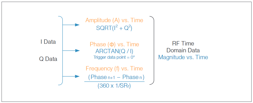 On the MDO4000 Series, the I and Q data from digital downconversion are also used to generate RF Time Domain traces. After digital downconversion, the IQ data is a Cartesian representation of the RF signal. As such, the IQ data can be transformed into amplitude, phase, and frequency information as shown in Figure 14.