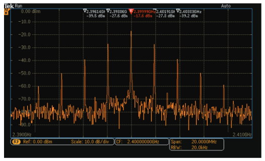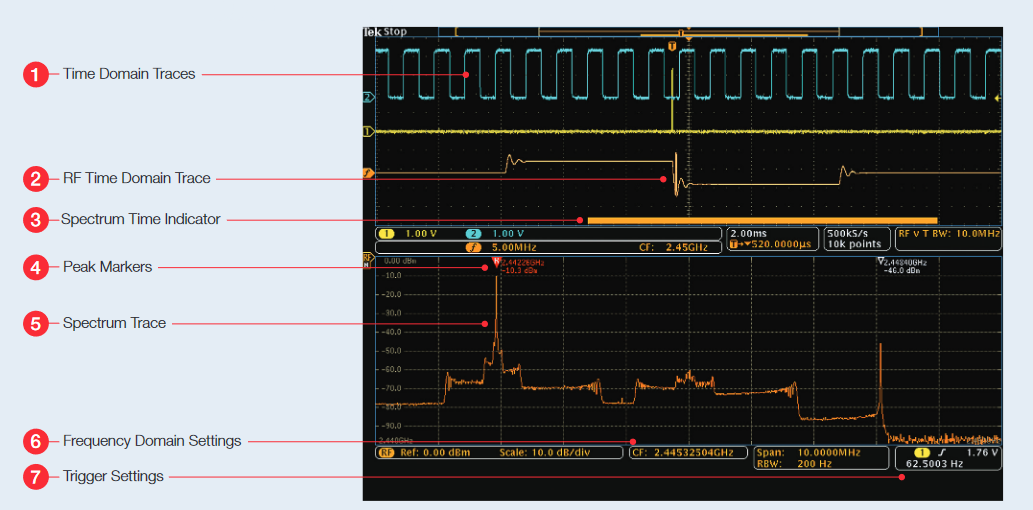 The MDO spectrum analyzer display (Figure 3) will look familiar and intuitive to spectrum analyzer users, with labeling of amplitude grid lines as well as start and stop frequencies, peak markers, and readouts of critical frequency domain parameters, including reference level, vertical scale, center frequency, span, and resolution bandwidth (RBW).