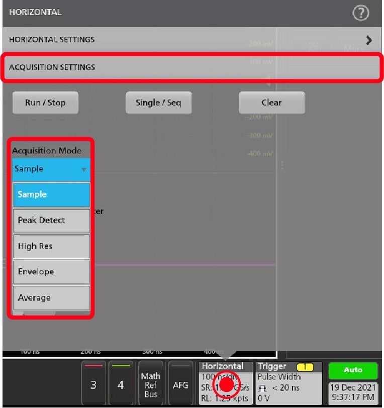 - Pour revenir au mode d’acquisition normal de l’instrument, appuyez sur l’icône Zoom située en haut à droite de la vue du signal, désactivez le mode Zoom, puis appuyez sur le bouton Marche/Arrêt de la face avant pour passer en mode Marche.