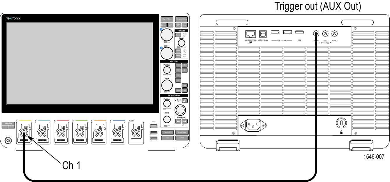 -  Use a 50 Ω cable to connect the AUX Out signal from the rear of the instrument to the channel 1 input of the same instrument, as shown in the following illustration.