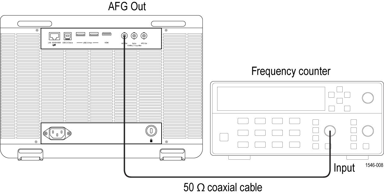 - Connect a 50 Ω cable from the AFG Out connector to the frequency counter input as shown in the following figure. Figure 1. Frequency/period test