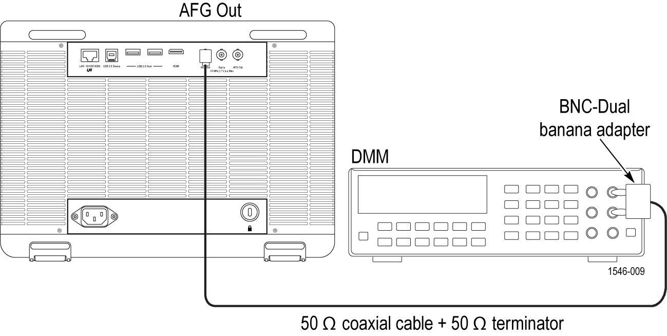 - Connect the arbitrary function generator output to the DMM as shown in the following figure. Be sure to connect the 50 Ω terminator to the AFG Out connector. Figure 2. Amplitude test
