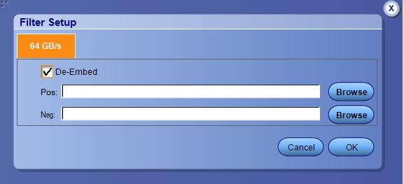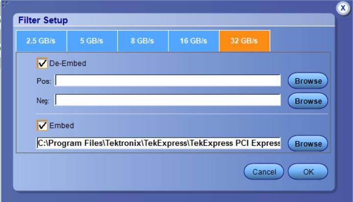 TekExpress PCIe provides an option to de-embed the signal path using filter files. You create the filter files. The filter files are .flt files composed of de-embed filter coefficients for a particular sampling rate. A filter file created for one sampling rate might not work for other sampling rates, so it is important to understand at what sampling rate the measurements are being performed.