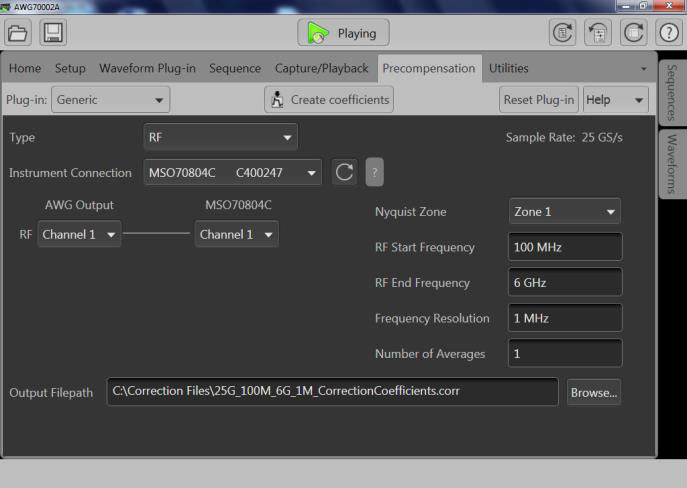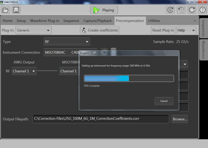 When you hit the “Create Coefficients” button, you’ll see a progress bar in the user interface while the AWG creates the test waveform, outputs it to the scope, and acquires it for analysis.
