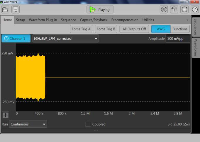 This is particularly beneficial for wideband RF signal generation. The simple example shown here illustrates how the application of precompensation can flatten the RF amplitude of a 1GHz wide LFM (Linear Frequency Modulated) pulse that is centered at 5GHz.