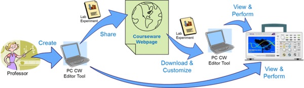画期的なツールでもあるコースウェア機能は、強力なコース・エディタPCソフトウェア、TBS1000B-EDUシリーズ・オシロスコープ、そしてコースウェアWebページの組み合わせによりエンジニアのための教育環境を構築します。 この新機能を使用すると、作成したラボの内容や操作手順書をTBS1000B-EDUシリーズ・オシロスコープに直接アップロードすることができます。 また既存のラボは、最近の講義に直接関係するコンテンツや、クラスのディスカッションから生まれた新しいアイデアにより編集して使用することができます。 学生はラボの操作手順をオシロスコープ上で行い、その進捗をオシロスコープのスクリーン・ショットと共にレポート・ファイルに記録することができます。 コースウェアの教材は、複数のラボ、学内の教授、学外および海外の教授の間で容易に共有することができます。 テクトロニクスのコースウェアWebページは、教育者が自分の教材を他者と共有すること、または、他者の画期的なアイデアをレビューして新たな知見を得ることができるように構成されています。