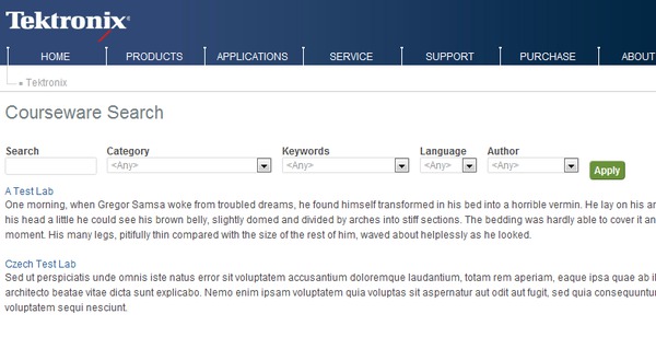 教育に携わる教授や教官にラボで使用する教材を作成するための新しいアイデアや興味を引くアイディアを提供するため、当社はコースウェア専用のWebページを開設しています。 このサイトでは、関連するコース教材をダウンロードしたり、自分のラボをアップロードして他の教育者と共有することができます。 また、このサイトには強力な検索エンジンが実装されており、キーワード、製作者、カテゴリ、トピック、言語に基づいてラボを検索することができます。 このサイトを利用するには登録が必要ですが、いったん登録すれば、教材のダウンロードとアップロード、試してみた教材についてのコメント投稿が自由にできるようになります。