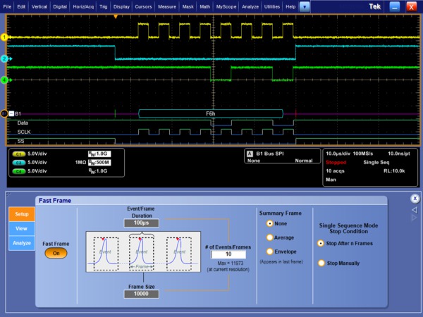 データ取り込みの効率を高めるために、メモリのパーティショニングによって取り込み時間を拡大できます。FastFrame™セグメント・メモリ・モードにより、最大290,000のメモリ・セグメントを選択して、毎秒310,000以上の取り込みレートを実現できます。メモリを柔軟に利用できるだけでなく、セグメントにはタイムスタンプが付けられるため、個別にまたは重ねて表示することができ、プロトコル・デコードなどの高度な機能を使用した解析を行えます。FastFrame™で取り込まれた信号は、アベレージまたはエンベロープ・モードを使用して後処理することもできます。