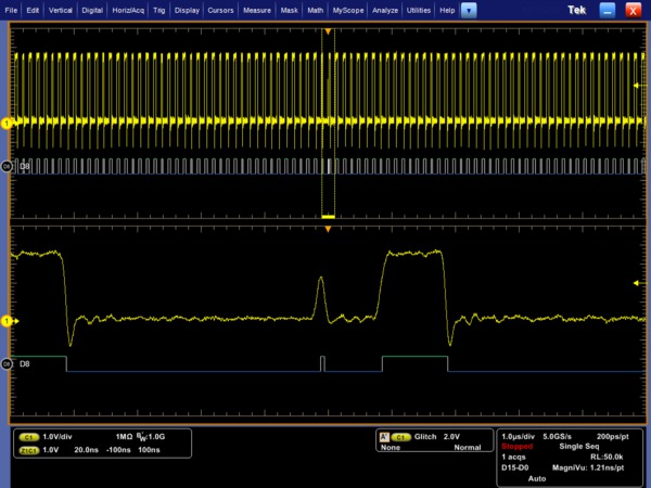 MSO5000Bシリーズは、より詳細なトランジションを検出するハードウェアを搭載しています。これにより、ズーム表示するか、より高速なサンプル・レートで取込むことで、より詳細な情報が得られます。ほとんどの場合、拡大表示することにより、それ以前の設定では見えなかったグリッチが見えるようになります。