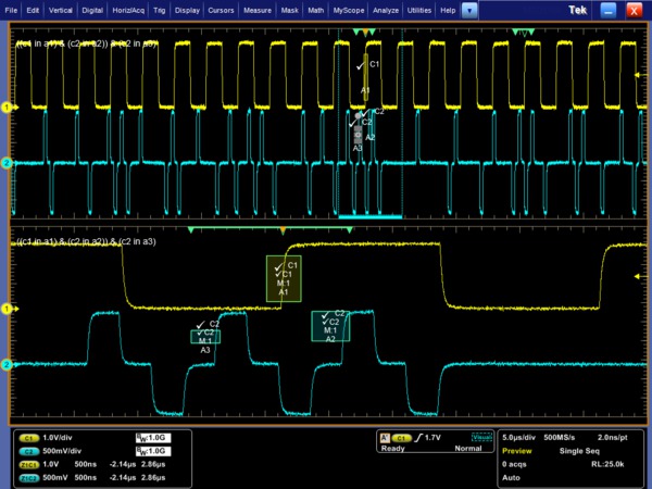 MSO5000Bシリーズのメイン・デジタル・アクイジション・モードでは、500MS/s(2ns分解能)で最大40Mポイントまで取込むことができます。メイン・モードの他に、MSO5000BシリーズにはMagniVuと呼ばれる超高分解能モードがあり、最高16.5GS/s(60.6ps分解能)で10,000ポイントを取込むことができます。メイン波形、MagniVu波形とも、すべてのトリガで同時に取込むことができ、取込み中、停止中であっても、いつでもいずれかを表示できます。MagniVuは、市場にある他のミックスド・シグナル・オシロスコープに比べて高いタイミング分解能があるため、デジタル波形における重要なタイミング測定を正確に行うことができます。
