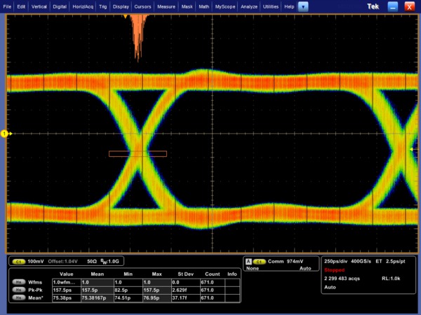 最大250Mポイントのレコード長により、数多くのイベントが取込めます。数千というシリアル・パケットでも1回で取込むことができ、分解能の高いままズーム表示して詳細に信号を観測できます。 タイム・インターバル・エラー(TIE)測定などの複雑な解析でも、長いレコード長により、クロック・リカバリの処理やジッタ・プロファイルの作成に必要なデータを取込むことができます。 同じクラスの他のオシロスコープと異なり、MSO/DPO5000Bはレコード長とサンプル・レートの両方を柔軟に設定できるため、最適な分解能を確保できます。