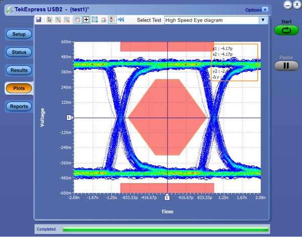 標準装備のリミット・テスト・パッケージは、長時間の信号モニタリング、設計における信号の特性評価、製造ラインでのテストに最適です。 リミット・テストは、ユーザが設定する垂直方向、水平方向のマージンを持った基準波形に対してテスト信号を比較します。 波形の数でテスト期間を設定したり、違反判定のためのスレッショルドを設定したり、統計情報にしたがってヒット・カウントしたり、違反時、テスト不良時、テスト完了時のアクションを設定するなど、独自のテスト用件でテストできます。