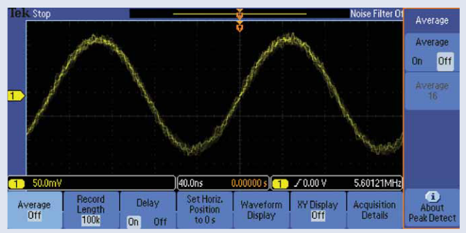 アベレージ・モードは、相関性のないすべての信号、ランダム・ノイズ、イベントを減衰します。また、非常に低い周波数からオシロスコープのすべての時間軸設定において機能します。