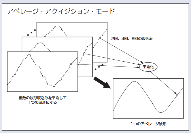 アベレージ・アクイジション・モードでは、何回かの取込みからポイントごとに平均し、各時間サンプルにおける平均電圧を求めます。平均する回数はユーザによって設定できます。一般的に、ノイズは波形取込みごとにランダムであり、ときには大きく、ときには小さくなります。これらのランダム変動を十分な回数で平均化することでノイズをキャンセルし、安定した波形を表示することができます。アベレージ・モードを利用するには、繰返し性の波形であることが必要です。繰返し性のない波形やシングルショット波形では平均化できません。