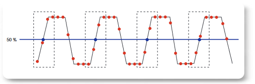 デューティ・サイクルの変動は、波形を多数捕捉し、測定することが重要です。CTSによれば、テストの目的では最低でも10,000波形が必要です。そこで、オシロスコープのトリガ・リアーム・レートが問題になります。一般に、オシロスコープのトリガ・リアーム・レートは、毎秒100波形(wfms/s)程度とされています。これでは、波形の捕捉やテストに膨大な時間がかかってしまいます。