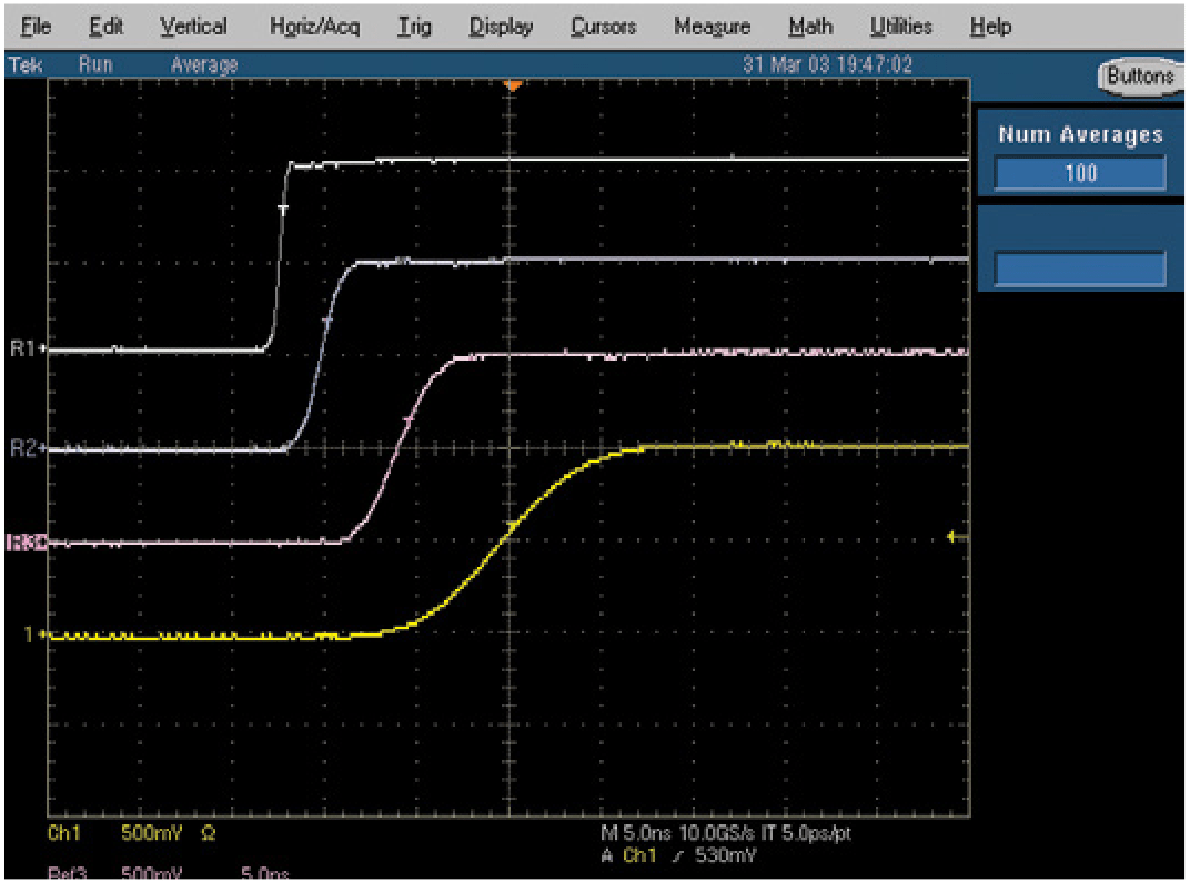 An instrument's bandwidth is an analog term that exists independently of its sample rate. The analog bandwidth of a signal generator's output circuitry must be sufficient to handle the maximum frequency that its sample rate will support. In other words, there must be enough bandwidth to pass the highest frequencies and transition times that can be clocked out of the memory, without degrading the signal characteristics. In Figure 24, an oscilloscope display reveals the importance of adequate bandwidth. The uppermost trace shows the uncompromised rise time of a high-bandwidth source, while the remaining traces depict the degrading effects that result from a lesser output circuit design.