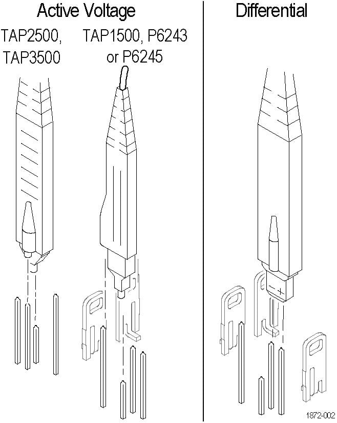 For Active Voltage probes (TAP1500, TAP2500, TAP3500, TAP4000, P6243, or P6245), connect the probe tip to the short pin and the probe ground to the long pin as shown.