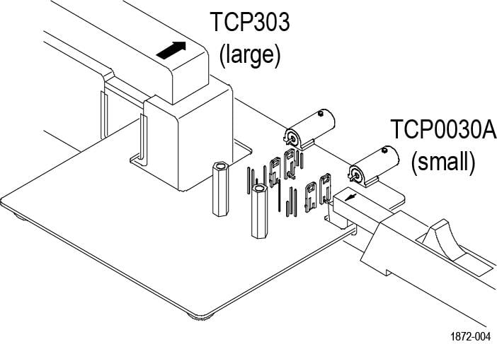 For TCP0030A, TCP0020, TCP2020, TCP202A, TCP312A, TCP305A, TCP0150, and TCP303 probes, connect the current probe around the current loop as shown. Be sure to align the polarity arrows on the current probe and the fixture, and make sure the current probe slider is closed and locked.