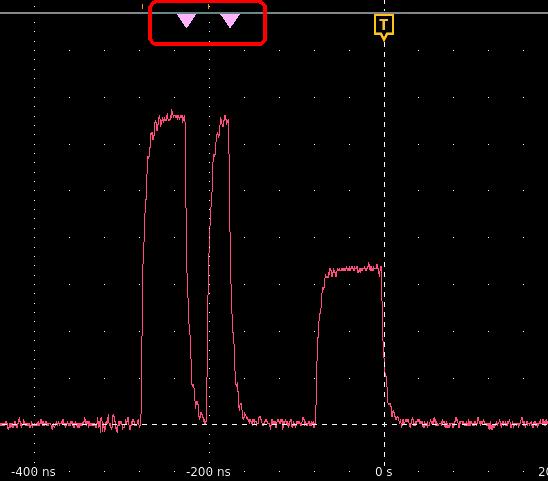 注:連続イベントは検索できません(検索タイプに「連続」(Sequence)はありません)。 - 検索された波形には、検索条件が反映されるとすぐに1つまたは複数の三角形のマークが付きます。検索では毎回、マーカーの色が異なります。画像例では、70ns未満の正のパルス幅を検索するために設定した検索条件が示されています。