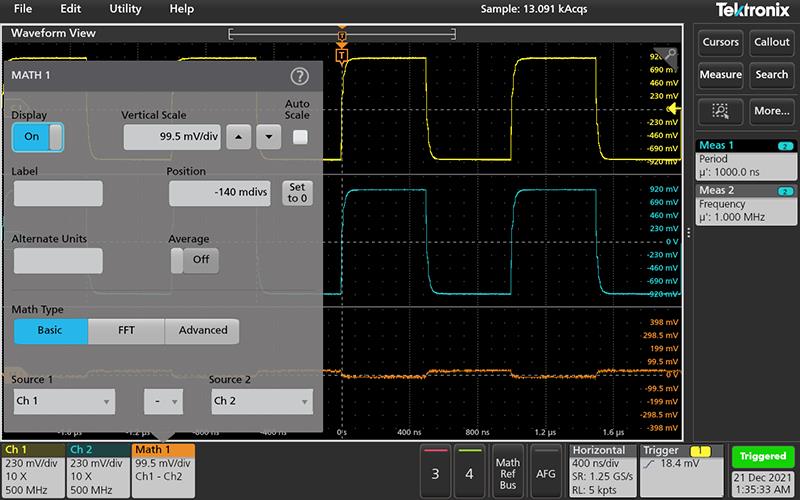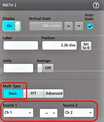 - 2つの波形間でカーソルを分割する場合は、Source(ソース)フィールドをタップしてSplit(分割)を選択し、各カーソルのソースを選択します。指定した波形にカーソルが移動します。
