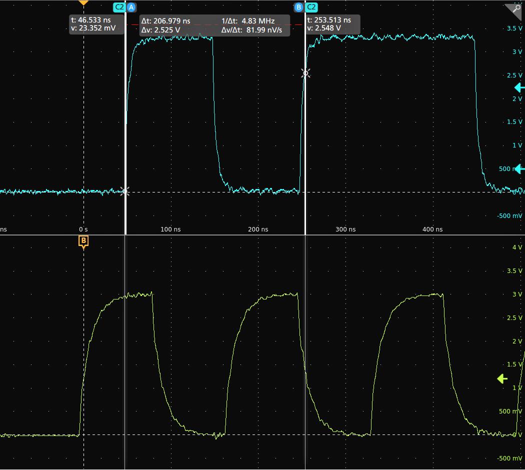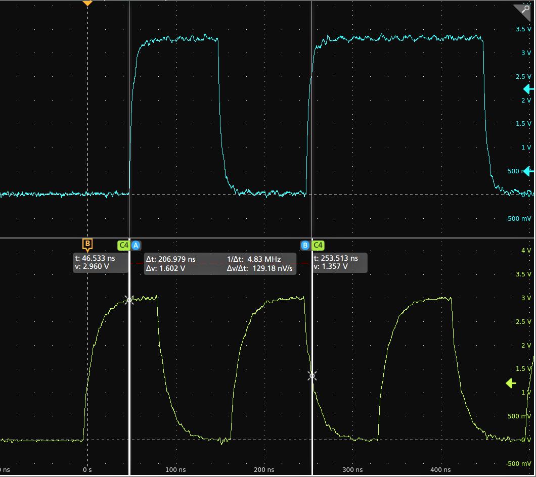 - カーソルを移動させるには、汎用ノブAとBを使用するか、またはカーソルをタッチしてドラッグします。カーソルには、そのカーソル間の位置とさまざまな測定を示すリードアウトが表示されます。