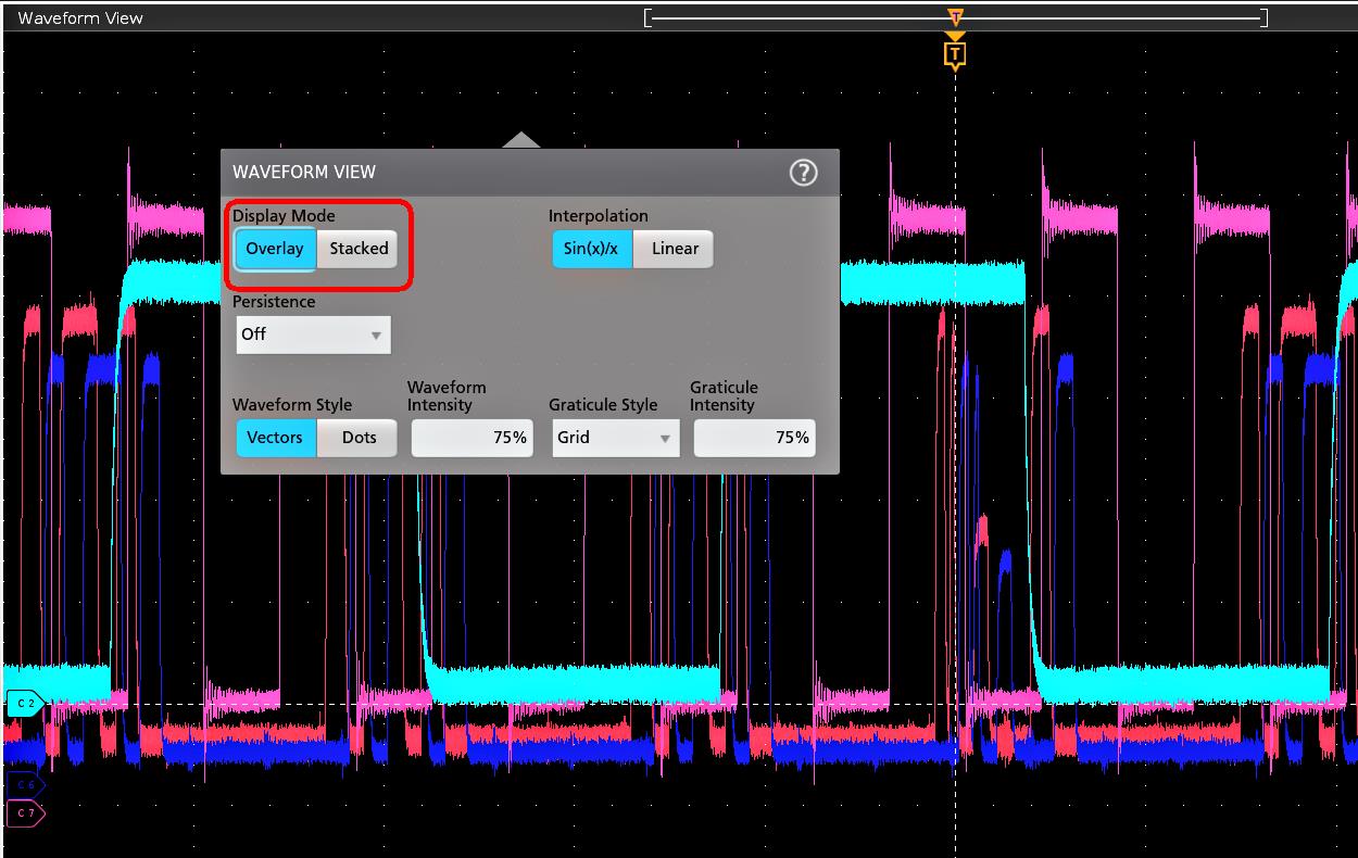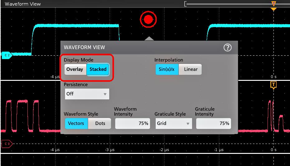 この手順では、Waveform display(波形ディスプレイ)モード(スタックまたはオーバーレイ)、波形トレース補間アルゴリズム、波形のパーシスタンスとスタイルと輝度、目盛のスタイルと輝度を変更します。