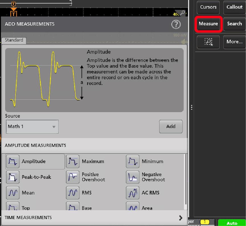 - Amplitude Measurements(振幅測定)または(タイミング測定)Time Measurements(時間測定)などの測定カテゴリ・パネルを選択して、これらのカテゴリに対する測定を表示します。