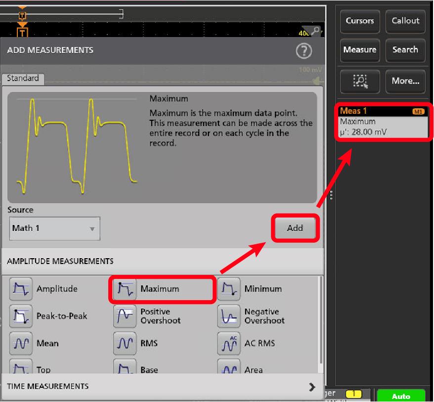 - 現在のソースに対して別の測定項目を選択して追加します。測定カテゴリ・パネルをタップすると別の測定が表示されるので、追加する測定を選択します。