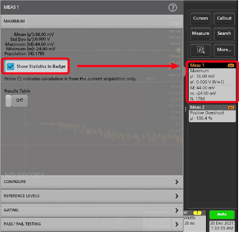 - Delete Meas(測定の削除)を選択すると、Results(結果)バーからこの測定バッジが削除されます。